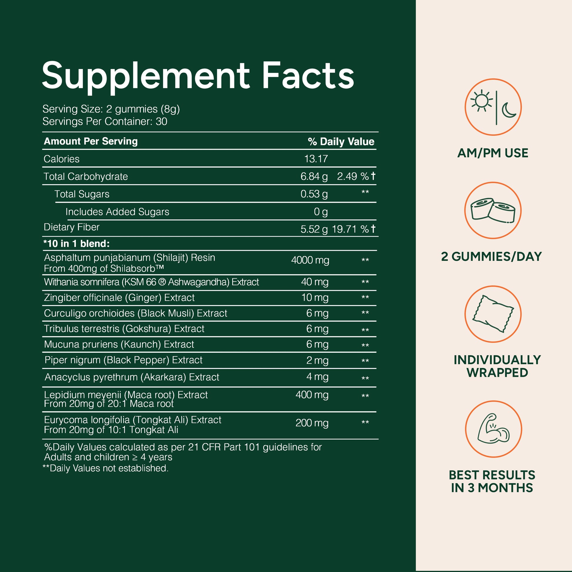 • SHILAJIT WITH MACA ROOT AND TONGKAT ALI: Powerful shilajit gummies for men and women that combine maca root and Tongkat Ali in a convenient gummy. Each serving provides 4000 mg of pure Himalayan shilajit (>16,000 feet) with 75% fulvic acid and over 85 trace elements for daily wellness.